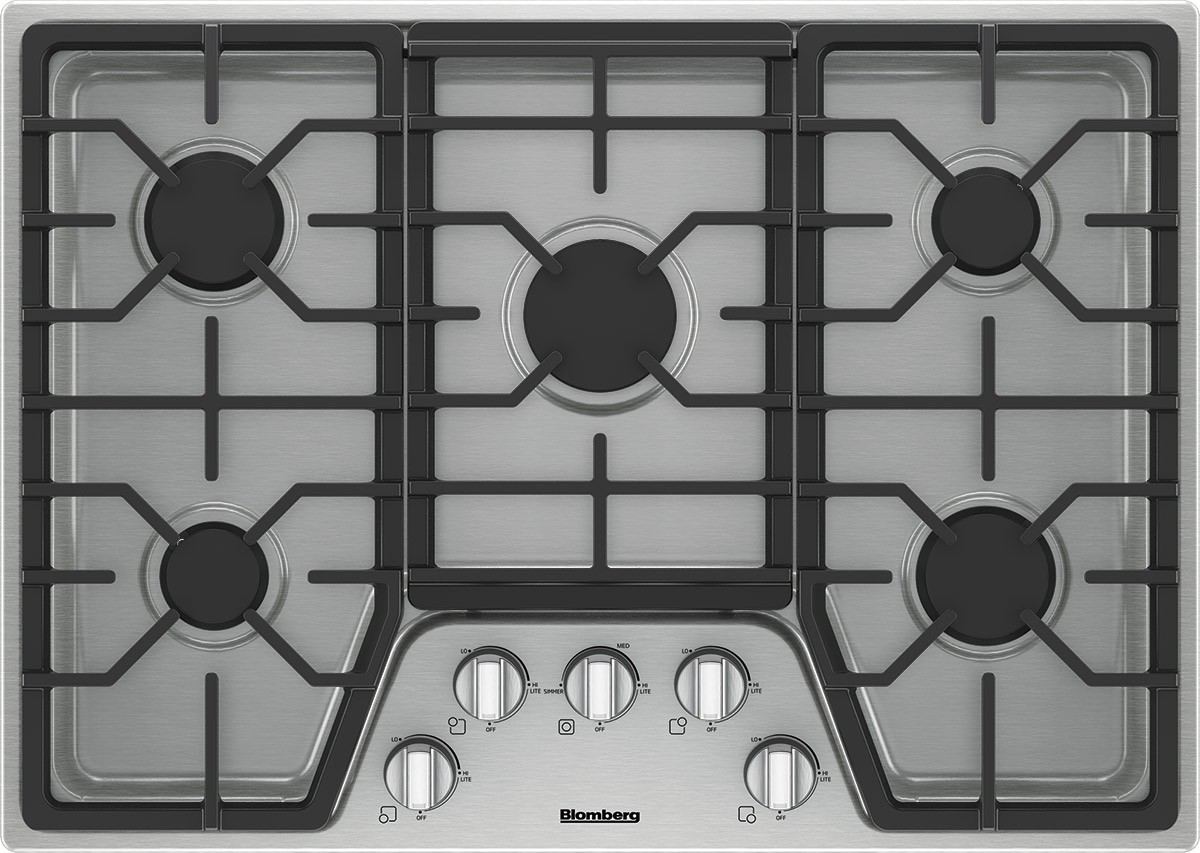 Blomberg® 30" Gas Cooktop, Four Gas + One Wok Burners, Sealed Burner, Re-ignition Controlled Burners, Gas Safety Device, Cast Iron Pan Supports, Integrated Ignition, Front Knob Control with LED Illumination, Griddle Accessory, Stainless Steel.Read More