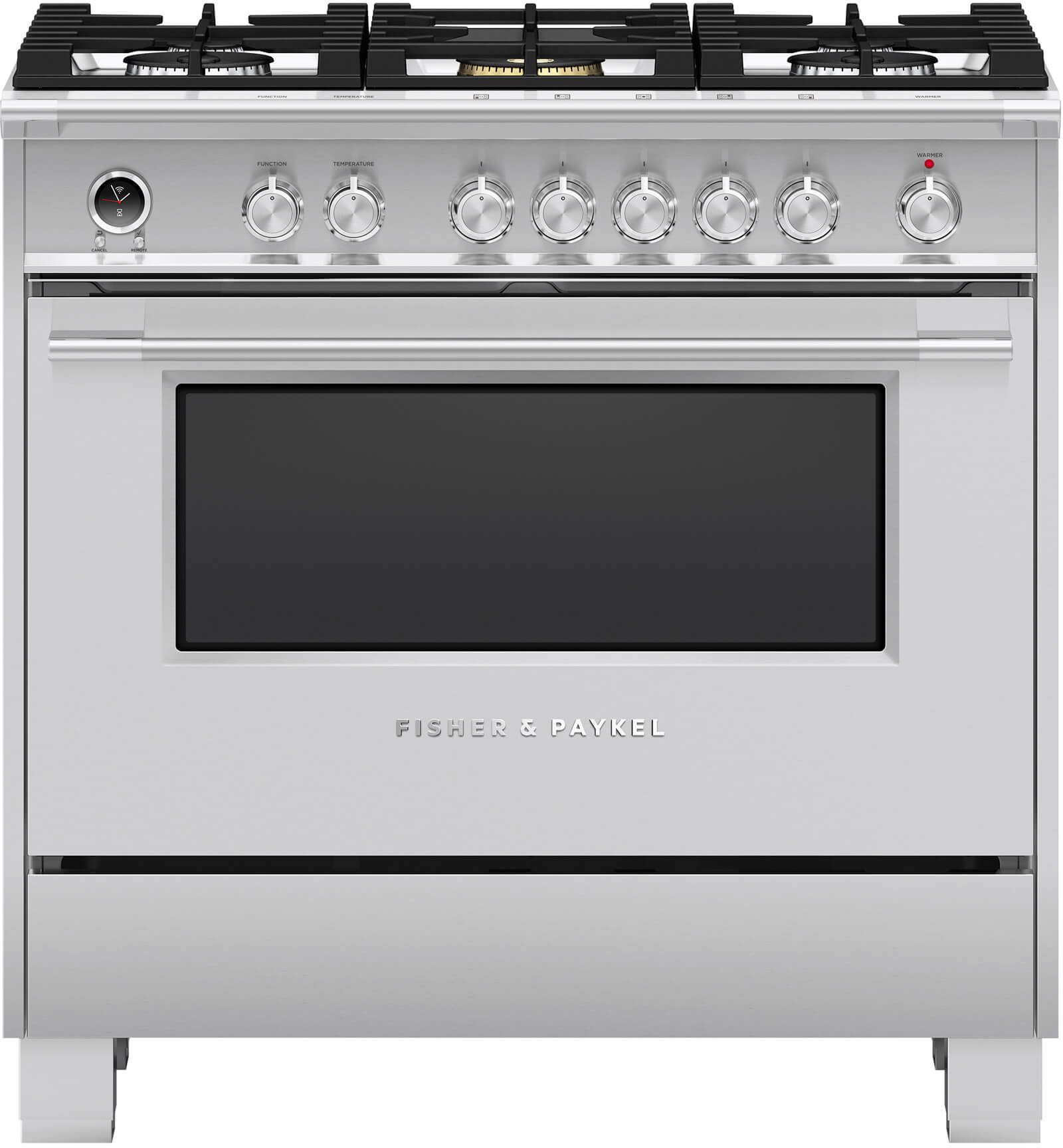 Heritage styling with contemporary performance in this 36” Fisher & Paykel Freestanding Range. You can cook several dishes at the same time with its spacious gas cooktop and generous convection oven. Instant heat and precise control add to the classic stylish brushed stainless steel with black glass finish.
