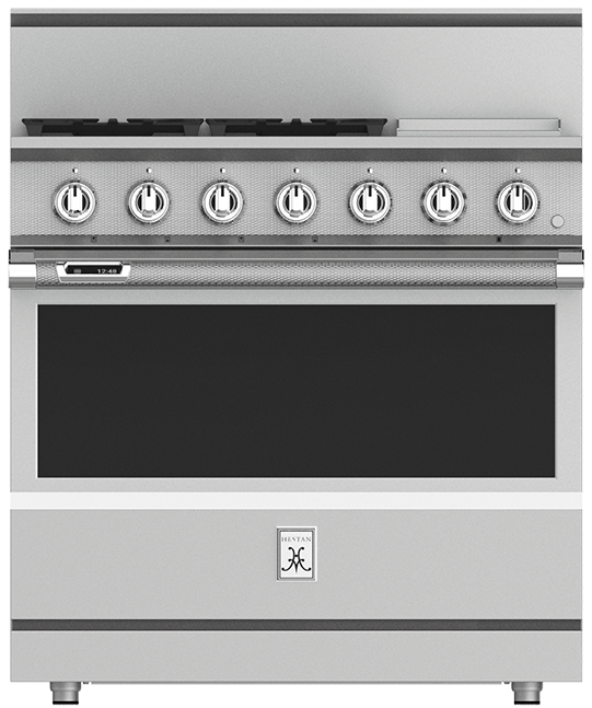 The 36” range delivers searing culinary power with a sealed burner system delivering exceptional temperature control for culinary power up to 23,000 BTUs and as low as 500 BTUs. The 12” commercial-grade stainless steel gas griddle makes breakfast a cinch with superior heating and a thermostat for precise temperature control. The high-performance oven features nine oven modes to perfectly complement your cooking style, and the MarquiseDisplay™ gives you a chef-friendly digital display – conveniently inset right in the oven handle.