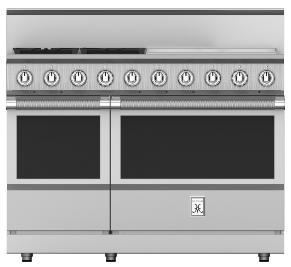 The Hestan 48" all gas range with 24" griddle provides searing culinary power with a sealed burner system delivering exceptional temperature control for culinary power up to 23,000 BTUs and as low as 500 BTUs. The high-performance oven features exclusive PureVection™ technology, which electronically controls multiple heating convection systems, to optimize baking, broiling, roasting and convection baking.Read More
