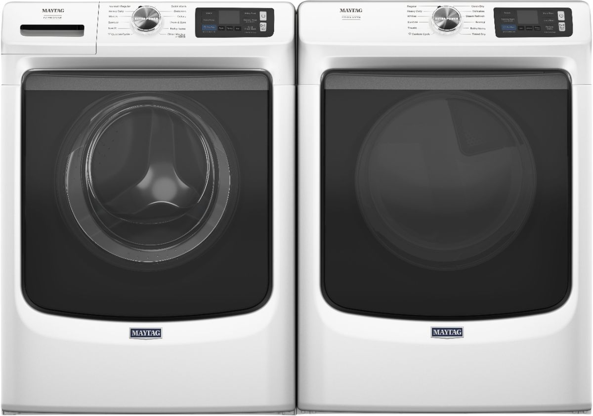 Maytag® White front load laundry pair with a 5.8 cu. ft. capacity front load washer and a 7.4 cu. ft. front load electric dryer.Read More