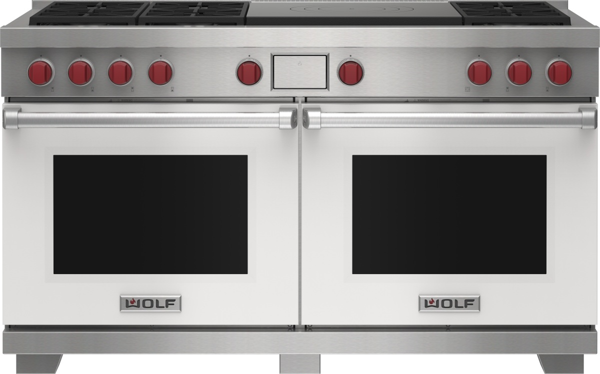 Wolf® 60" White Freestanding Dual Fuel Range and French Top features dual-stacked, sealed burners, Dual VertiFlow™ convection system, Gourmet Mode, 10 chef-created cooking modes, LED backlit control bezels, self-clean, delayed start, timed cook, and Sabbath features.Read More